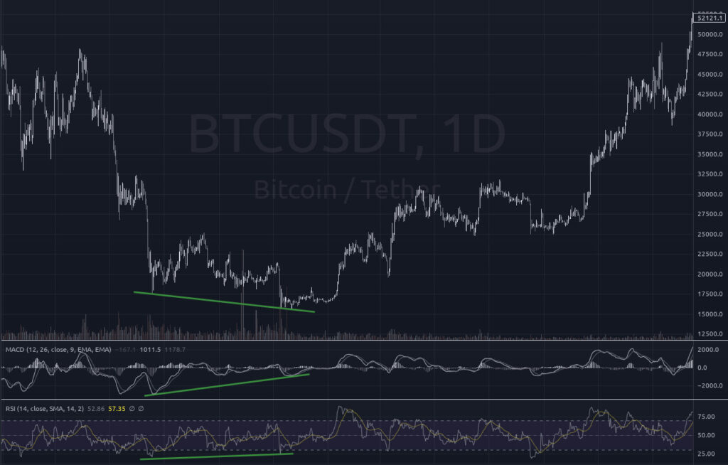 Las divergencias ocurren cuando el precio de un activo y un indicador técnico, como el RSI (Índice de Fuerza Relativa), el MACD (Media Móvil de Convergencia/Divergencia) o incluso el Oscilador Estocástico, se mueven en direcciones opuestas. Estas divergencias pueden ser señales importantes de un posible cambio en la dirección del precio.