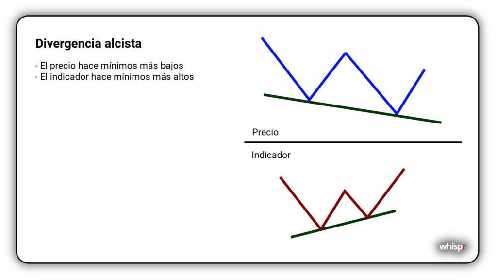 - Señal: Una divergencia alcista en esta situación sugiere que la presión vendedora está disminuyendo y que puede haber una reversión al alza.