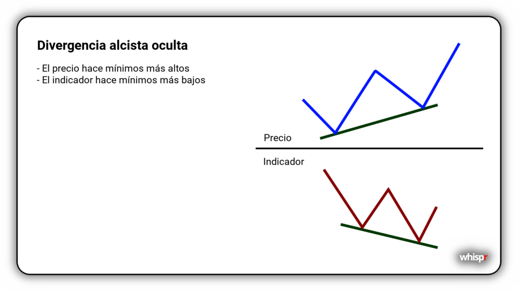Imagina que nuestro activo ha estado subiendo y el precio forma un mínimo más alto. Sin embargo, el RSI forma un mínimo más bajo. Esta divergencia oculta alcista sugiere que la tendencia alcista probablemente continuará.