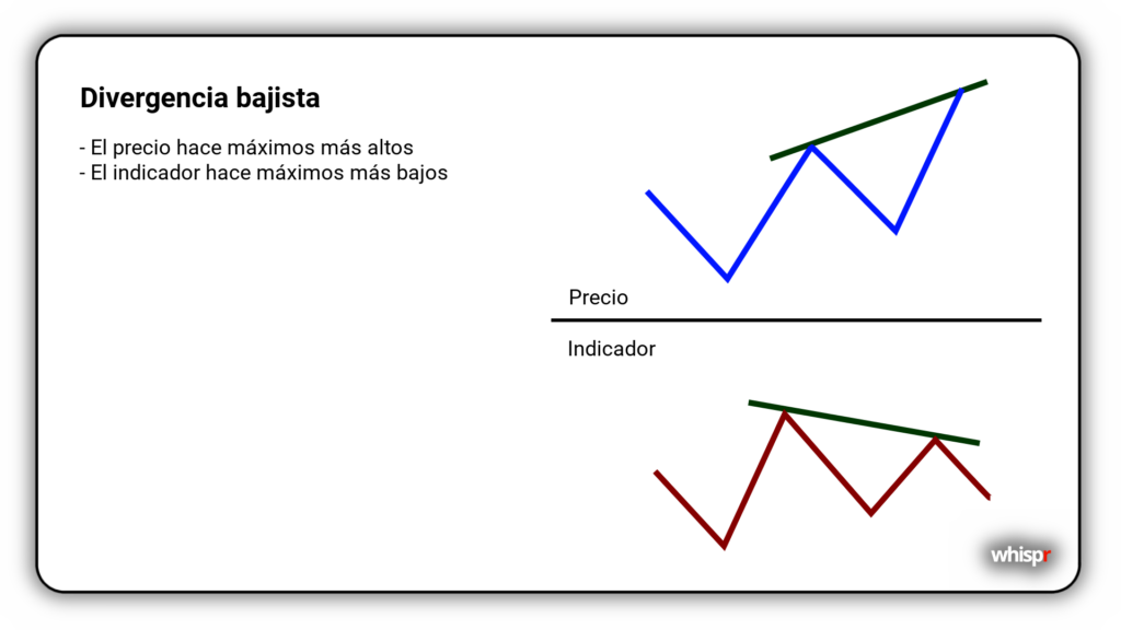 Una divergencia bajista se produce cuando el precio de un activo alcanza un nuevo máximo, pero el indicador técnico forma un máximo más bajo. Esto puede indicar que la presión compradora está disminuyendo y que podría haber un cambio hacia una tendencia bajista.