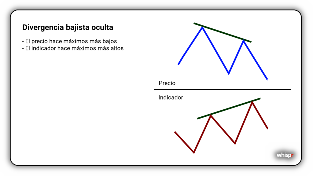 Una divergencia oculta bajista ocurre cuando el precio forma un máximo más bajo, pero el indicador técnico forma un máximo más alto. Esto sugiere que, a pesar de un repunte en el precio, la tendencia bajista subyacente sigue siendo fuerte y probablemente continuará.