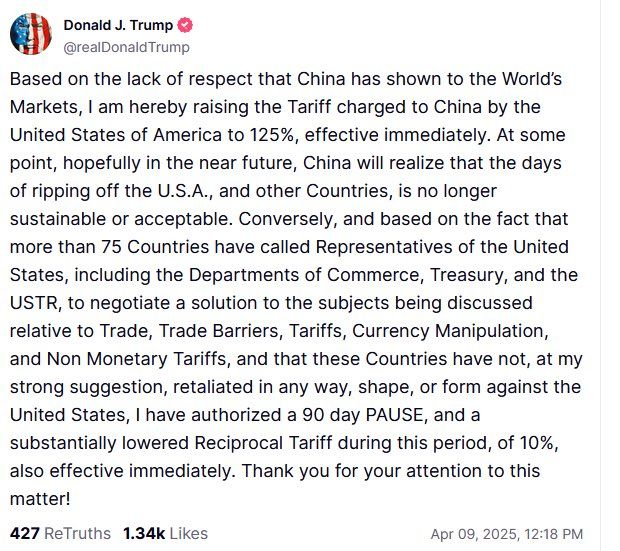 El Presidente de los Estados Unidos Donald Trump, ha anunciado una pausa prudencial de 90 días a todos aranceles recíprocos anunciados la semana pasa; exceptuando a China; impactando positivamente los mercados.